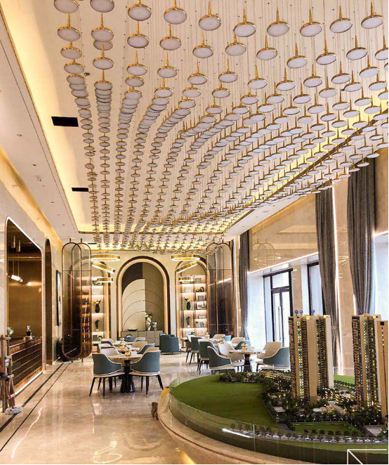 洽談區(qū)吊燈繁多,安裝時為了展現(xiàn)造型組合在一起的線條優(yōu)美,千里馬裝飾施工隊伍煞費苦心。