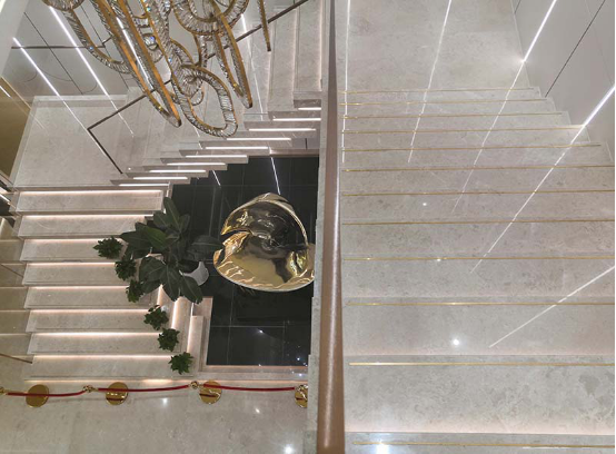 其次是石材旋轉(zhuǎn)樓梯,設(shè)計排版要求高,安裝工藝精細。